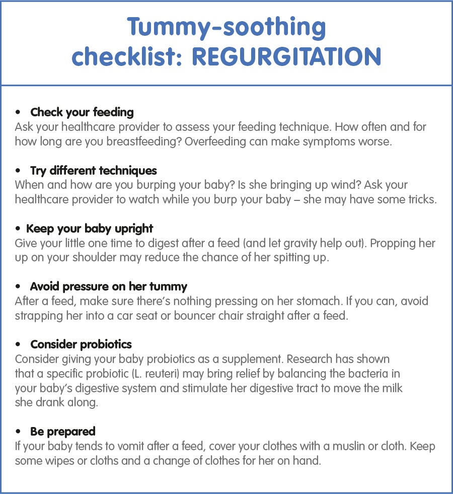 If it’s confirmed that your baby has colic, regurgitation (spit-up), or constipation, here are some ways you might try to help.